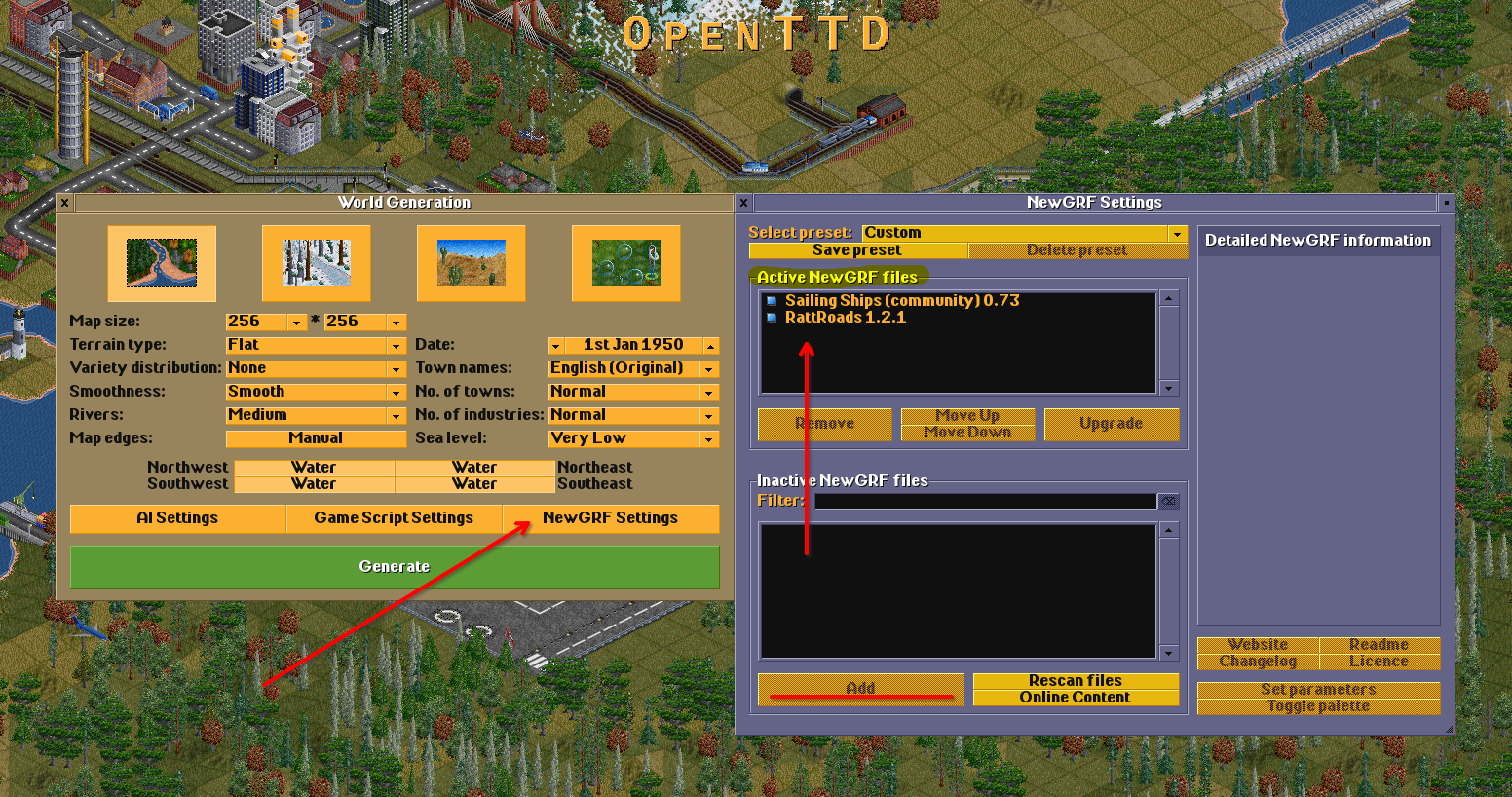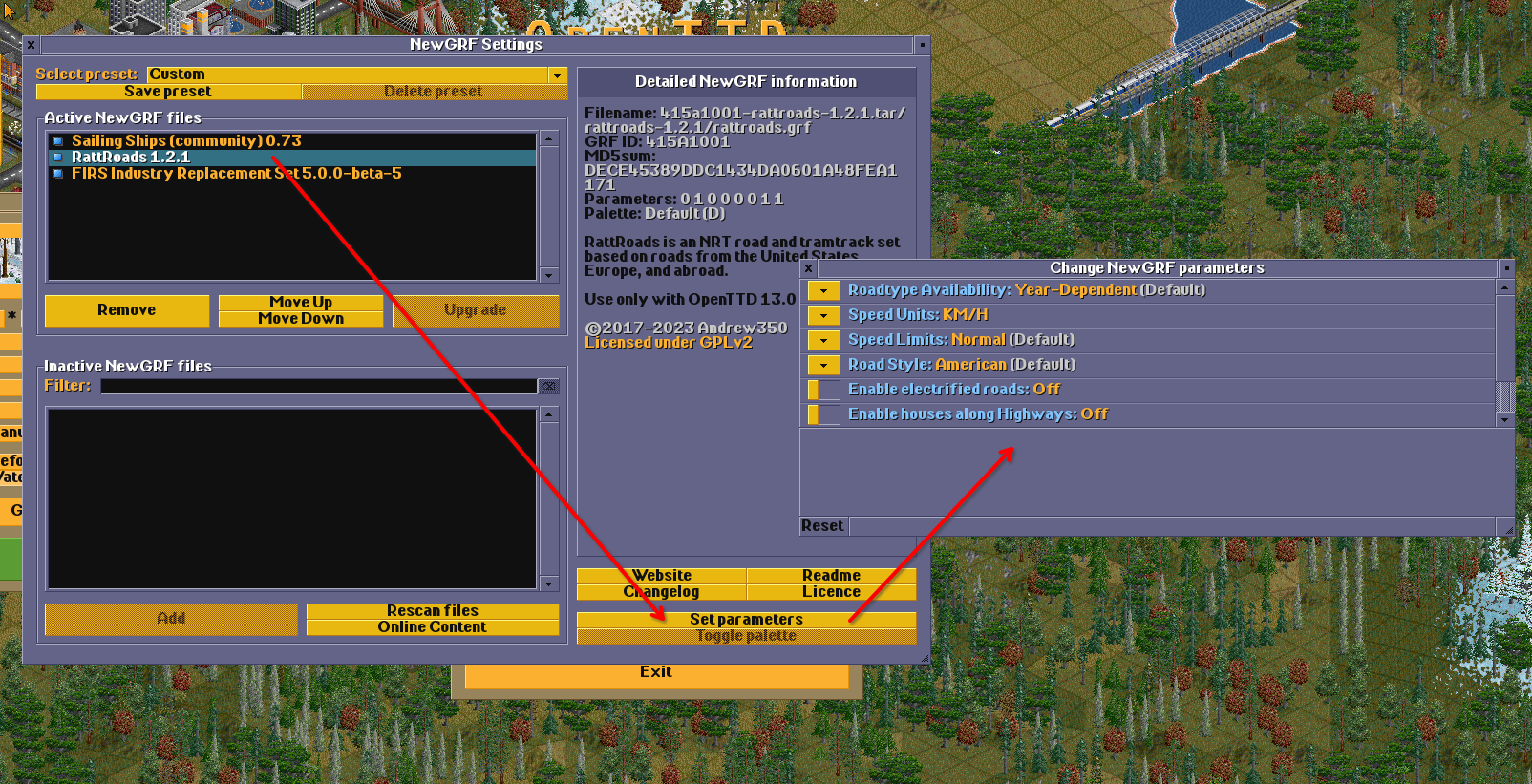 Be sure to click on Set parameters for each NewGRFs and adjust as needed.