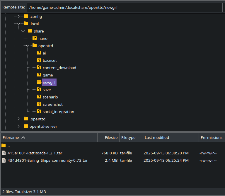 Use an sftp application like FileZilla to transfer the NewGRF files from your machine to the server. Do not extract the tar archive files.