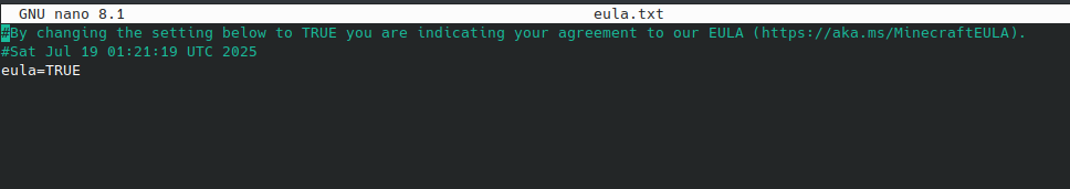 sudo nano eula.txtUse the arrow keys to move your cursor. Replace FALSE with TRUE. Then press Ctrl + x to exit and then y to save when prompted.