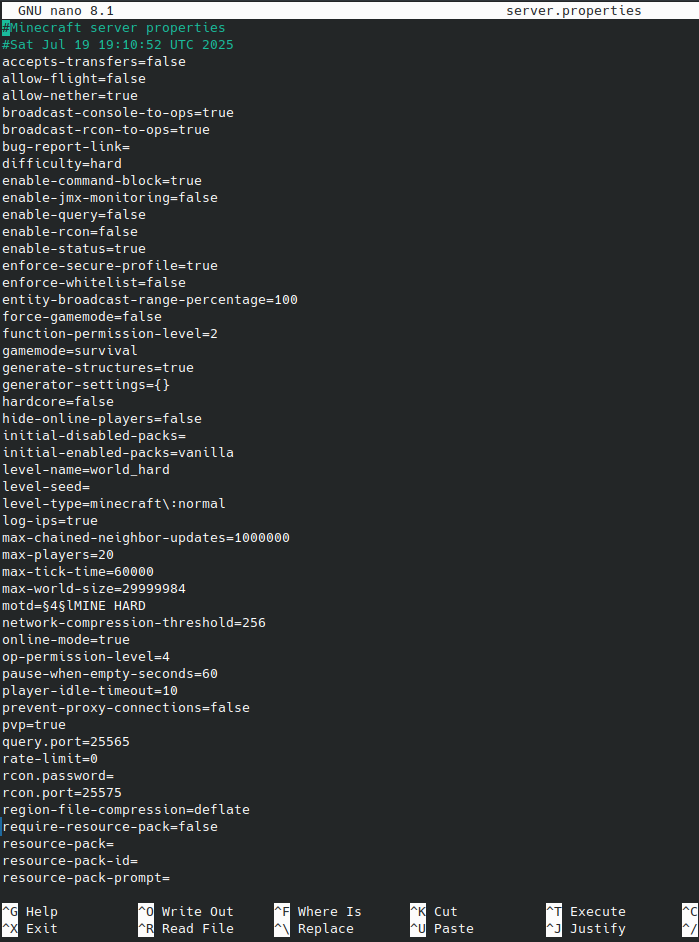 sudo nano server.propertiesThe community "Minecraft Wiki" has detailed information on settings for the properties here: https://minecraft.wiki/w/Server.properties